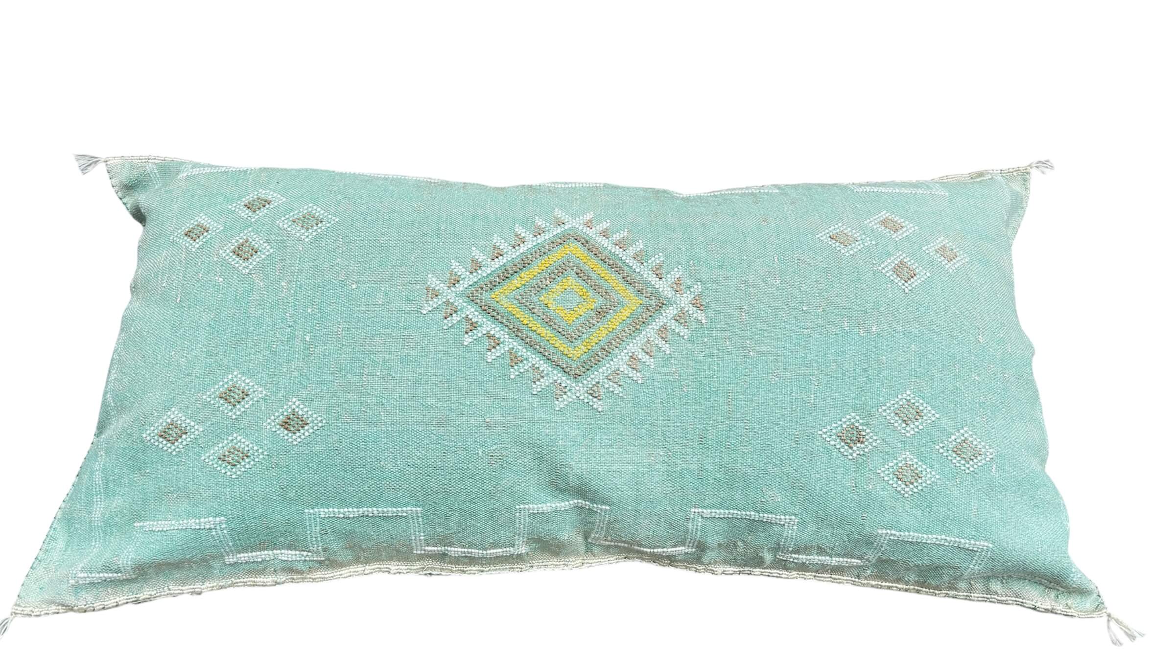 Turquoise staat in de Berbercultuur voor bescherming en kracht. Dit handgemaakte sabra silk Turquoise kussen is volledig met de hand geweven en geborduurd door Marokkaanse ambachtslieden. Elk detail ademt traditie en symboliek. Een uniek woonaccessoire dat bescherming, energie en de ziel van Marokko in je huis brengt.